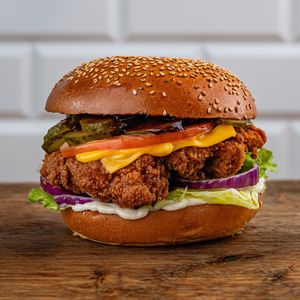 Panierowane podudzie z kurczaka, mieszanka pumpkin spice & wędzona papryka, cheddar, 2x bekon, piklowana dynia, sałata lodowa, ketchup z dyni z miso, wiśniowy BBQ, sos orzechowy