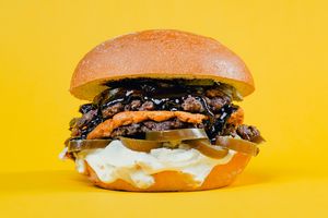 2 x wołowina smash, 2 x bekon, 2 x cheddar, krążki cebulowe, jalapeno, cebula, sriracha mayo