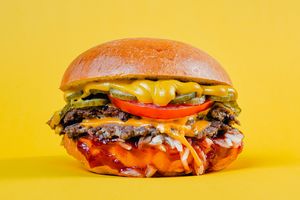2 x wołowina smash, 2 x cheddar, ogórek konserwowy, pomidor, cebula, ketchup, musztarda