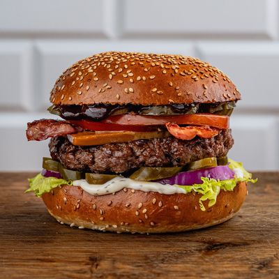 180 gramów wołowiny, sałata lodowa, ogórek kwaszony, czerwona cebula, pomidor, 2 x bekon, norweski kozi brązowy ser karmelowy, marynowana papryka jalapeno, sos limonkowy, sos BBQ
